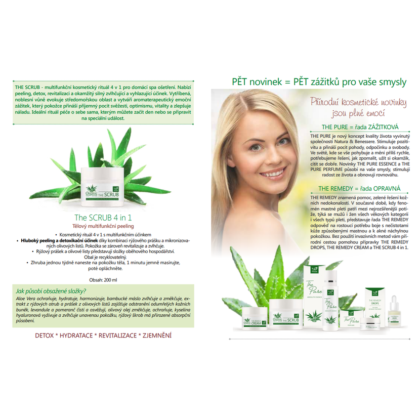 Kosmetický rituál 4 v 1 s multifunkčním účinkem - peelingový a detoxikační efekt díky kombinaci rýžového prášku a mikronizovaných olivových listů, zároveň pokožku revitalizuje a zvlhčuje.