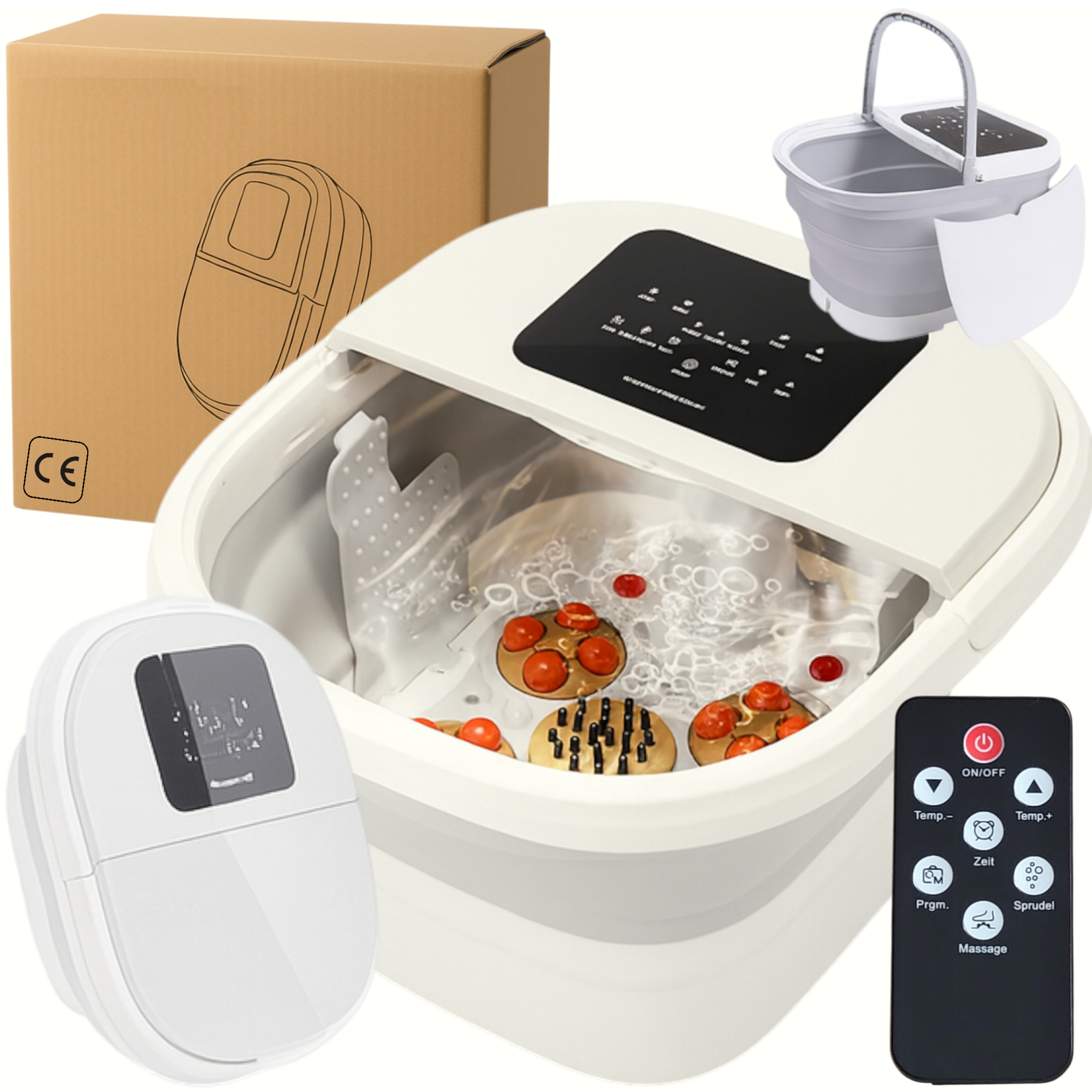 Masáž lze snadno přizpůsobit individuálním potřebám díky čtyřem automatickým programům, regulaci délky ošetření v rozmezí 10–60 minut a nastavení teploty vody od 35 do 47 °C. Kombinace čtyř masážních sekcí, 16 Shiatsu kuliček, akupresurní středové zóny, bublinkové masáže a infračerveného světla zajišťuje komplexní péči o unavená chodidla. Praktické prvky jako dotykový displej, dálkové ovládání, automatické ohřívání vody, bezpečnostní Auto-Stop, ukazatel hladiny vody či nádoba na sůl a bylinky zvyšují komfort používání. Díky lehké, odolné konstrukci z plastu a silikonu, skládacímu provedení a madlu pro přenášení je přístroj snadno manipulovatelný a nenáročný na skladování.