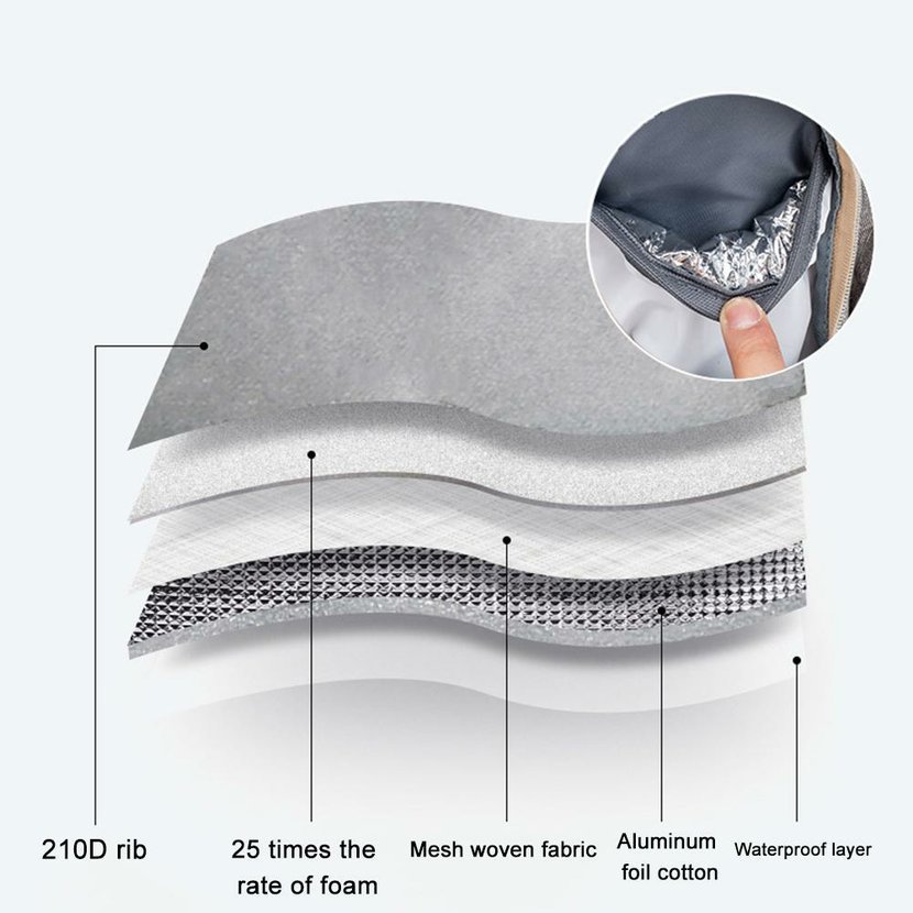 • podšívka 210D, 25 dílů pěny, pletený materiál ze síťoviny, bavlna z hliníkové fólie, vodotěsná vrstva