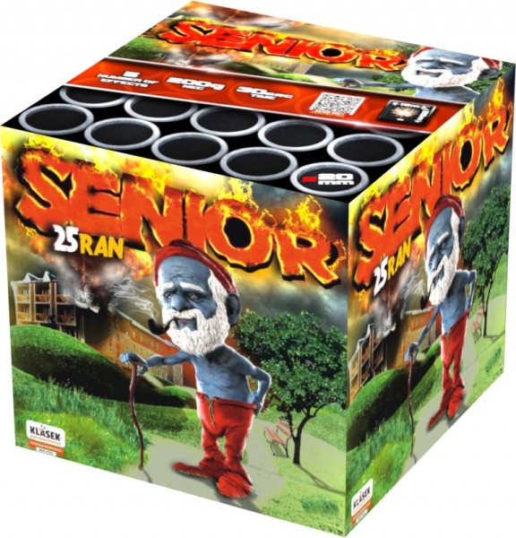 Ohňostrojový kompakt Seniormá tvar krychle. Uvnitř kompaktu jsou uloženy trubice s jednotlivými ranami.