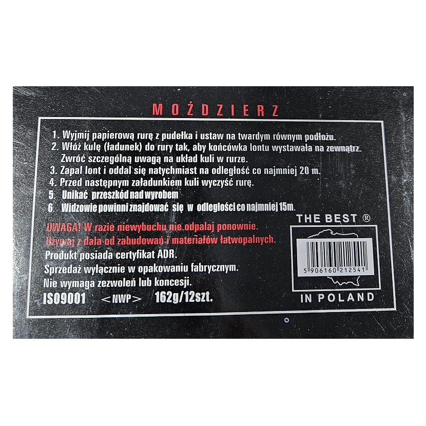 Bezpečnostní pokyny: moždíř musí stát na pevné a nehořlavé podložce. Po zapálení kulové pumy odstupte alespoň o 40-50 metrů. Při zapalování zápalnice se nikdy nenaklánějte nad výmetnou částí moždíře a dávejte pozor, aby na moždířem nebyly ani žádné jiné překážky ( dráty el.vedení, stromy apod. )