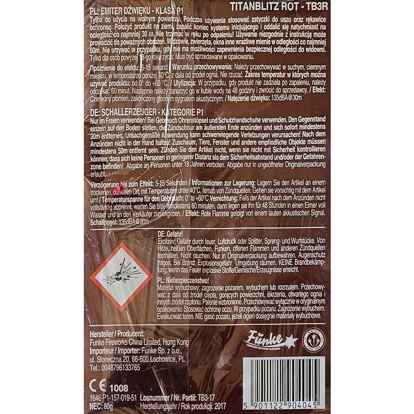 Bezpečnostní pokyny: Pouze pro venkovní použití! Nezapalujte v ruce! Umístěte petardu jednotlivě na zem, mimo dosah snadno zápalných látek. Zapalte konec zápalné šňůry a ustupte min. 15 m. Diváci musí být vzdáleni min. 25 m. Zvuk a výbuch se projeví přibližně po 6-8 s. Pokud funkce selže, nechte výrobek asi 10 minut v klidu a poté jej ponořte do vody po dobu 24 hodin. Jiná manipulace je zakázána! Skladujte na suchém místě, mimo dosah zdrojů tepla. Nesprávné používání může způsobit vážné zranění.