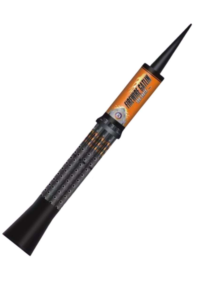 Sada svíci Firewire Gatlin 300 v balení jako kulomet - Svíce mají tvar podlouhlého tenkého válce. Po upevnění římské svícezačnou do výšky 10 až 15 metrů vystřelovat různobarevné světlice.